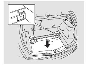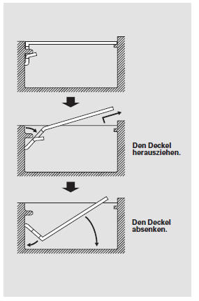 Sie können diesen Deckel auch bis auf den Boden des Stauraums absenken, um den Gepäckraum zu vergrößern. Den Deckel öffnen, ganz zu sich hin ziehen, um den Deckel aus den Stützen zu lösen, dann den Deckel auf den Boden des Stauraums absenken.