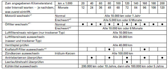 Dieser Wartungsplan enthält die Mindestanforderungen, die erfüllt werden müssen, damit Ihr Fahrzeug einwandfrei funktioniert. Aufgrund regionaler und klimatischer Unterschiede können zusätzliche Wartungsarbeiten anfallen. Eine ausführliche Beschreibung ist dem Serviceheft zu entnehmen.